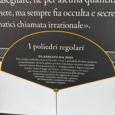 L’idea che sottende l’allestimento è che la proporzione non sia soltanto un calcolo ma un principio di relazione un ponte tra poli opposti, tra materia e spirito, tra ordine e caos.  Rifacendosi alle intuizioni di Luca Pacioli e alla “divina proporzione”, il percorso si dirama in installazioni, mappe, opere inedite che attraversano epoche e linguaggi, fino all’intreccio con l’era contemporanea: algoritmi, economia delle relazioni, design parametrico e intelligenza artificiale.